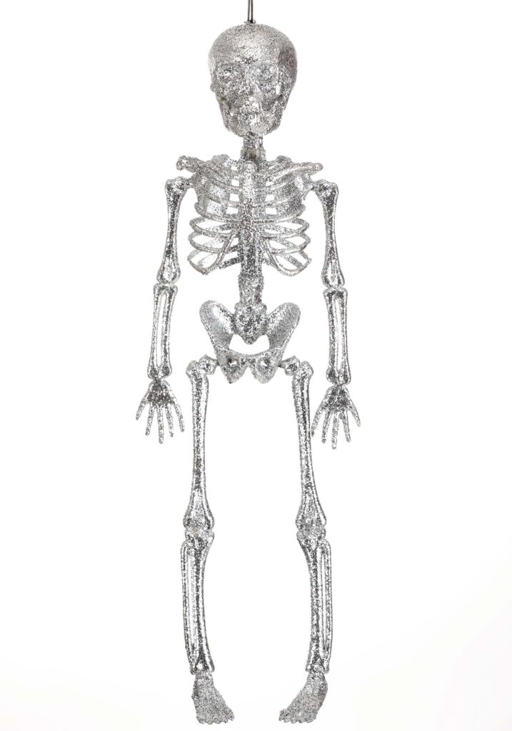 Product DetailsHalloween is as good a time as any for some razzle dazzle! This exclusive Silver Glitter Skeleton Halloween Decoration will be an eye-catching addition to your home or yard. The molded plastic skeleton is roughly sixteen inches tall and is covered head to bony toe in metallic silver glitter. Its articulated jaw, neck, and hips are fun features, and a cord loop is attached to the top of the skull for hanging purposes. “Boos” with Bling He’s still a little spooky, but this skeleton is more of a haute couture haunt then he is a ghastly apparition. Regular parties have disco balls – why not make this guy the centerpiece of your Halloween festivities this year? He promises to keep it classy.