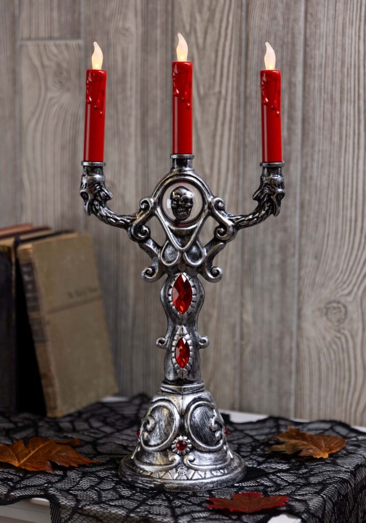 Set the scene with a 17.5 Inch LED Candelabra Prop! The molded candelabra features intricate details on its base and arms. It’s painted to look like antique silver and is set with red plastic “gems” as well as a red skull decoration. Three red candles with LED “flames” are included.