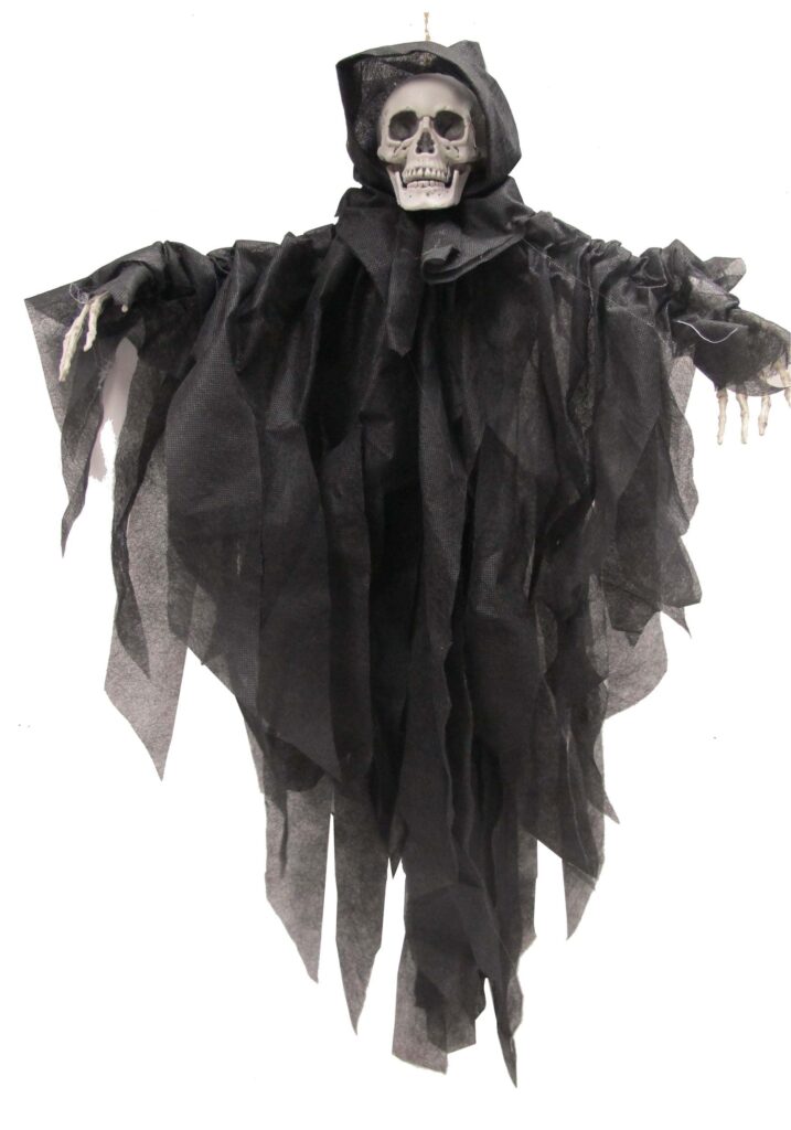The perfect piece for apartments and entryway porches, this Grim Reaper decoration packs a lot of punch for its size! The tattered layers of the black robe are sure to catch in the breeze and send shivers down your spine. Hanging from a loop on the top of the head, it’s easy to display your dismal prop. Ready to store it away for the season? With a cloth body, death will hardly take up any holiday storage until he’s ready to spread his spooky arms again next year!