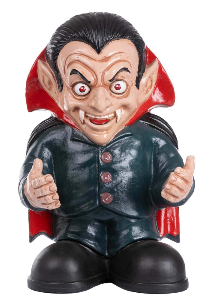 Design & DetailsStanding at a formidable 22 inches, our vampire, cloaked in mystery and spooky details, extends its arms, ready to serve your guests from the clear plastic bowl it proudly holds. Each arm, intricately designed to capture the essence of the nocturnal nobility, screws into the body, ensuring that your candy is held with the grace and stability that only a vampire could offer.The clear bowl is equipped with holes that perfectly sit atop the vampire’s thumbs, securing your sweets under the watchful eyes of this elegant creature of the night. Measuring 22″ H x 13″ W x 12″ D, it’s the perfect size for a hauntingly inviting candy display.A Hauntingly Hospitable HostScare your guests and trick-or-treaters with a host who’s been waiting centuries for just such an occasion. Perfect for a party centerpiece or a spooky welcome at your door, this vampire is eager to share the bounty of the night. So, dare to embrace the dark side of delight this Halloween, and let the festivities begin with a touch of timeless terror.