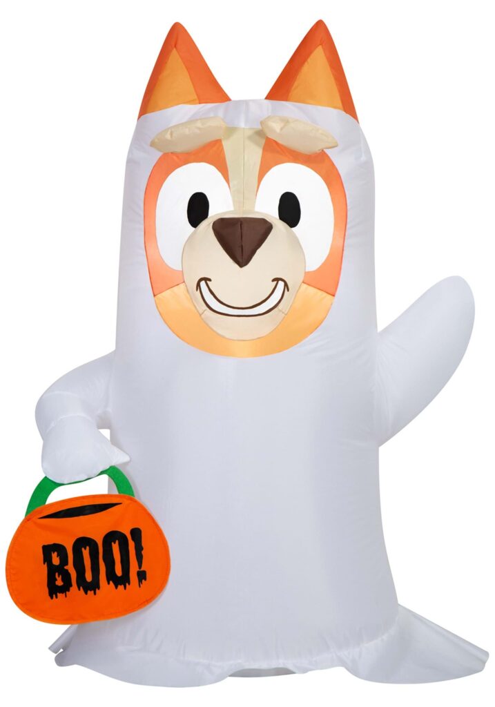 If you thought Bingo Heeler couldn’t get any cuter surprise! She’s gone full ghost mode. This Inflatable Bingo Ghost Decoration brings everyone’s favorite little sister from Bluey to your lawn in the most adorable sheet-ghost disguise ever attempted. With a sweet smile and a pumpkin bucket that says “BOO! ,” this officially licensed inflatable is here to charm every neighbor, dog walker, and passing squirrel.It’s spooky-ish. It’s silly. It’s pure Bingo energy.