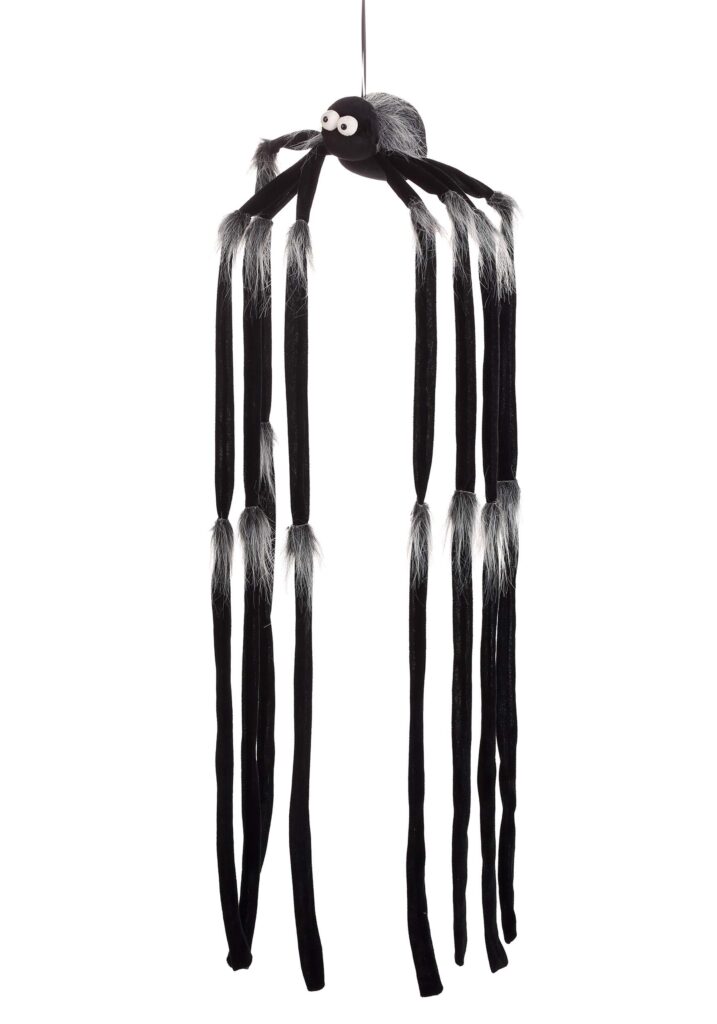 The sheer size of this monstrous spider , 3.6 feet! , is what makes it such a statement. It features a stuffed, black body and head, along with two big spider eyes and, of course, 8 long, drapey legs. In the middle of each leg is a tuft of gray faux fur that is truly creepy. After all, the only thing worse than a huge spider is a huge hairy spider! Just imagine walking to the snack table at a party and feeling something brush your neck, only to look up and find this beast hovering over you. Shudder. Happy Halloween!