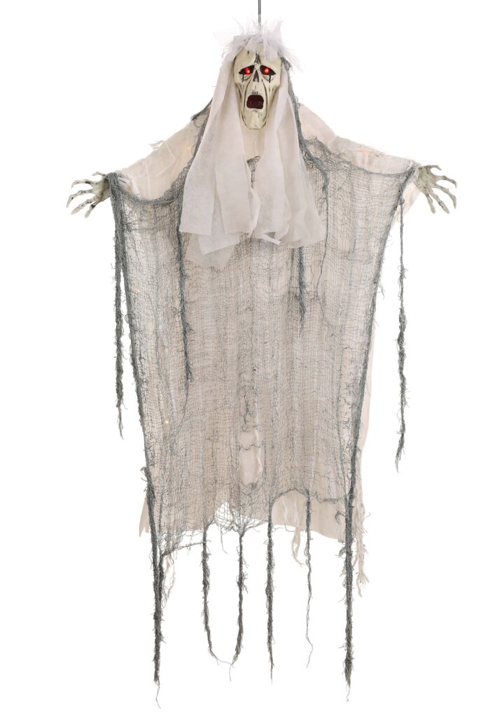 Design & Details Fortunately, you’ll never get that far into the spooky tale of Halloweens Past. That’s because your future is paved with fun thanks to this Hanging Light-Up Ghost decoration! This creepy haunt will hover wherever you place it thanks to the loop at the head. The look of a haunted shroud is created with tattered layers of cloth and a moaning ghastly face is created from molded plastic. Turn on the power to give your guests the fright of two glowing red eyes, too! This piece of Halloween decor will be legendary!