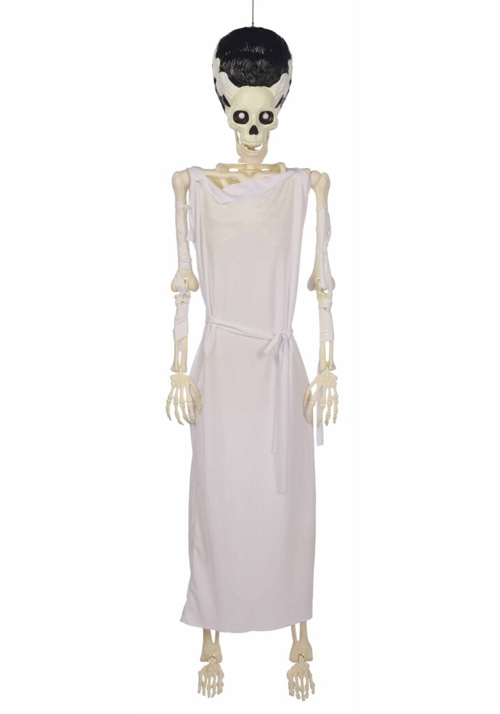 Standing (well, hanging) at a full 5.4 feet tall, this skeletal specter features posable joints, a molded plastic frame, and a ghostly white dress with a tied waist for that bridal-afterlife chic. Her iconic shockwave hairstyle is sculpted right into the skull, so there’s no mistaking who walked down the aisle, straight into the land of the undead.When the lights go out and the black light flips on, she glows like she just left the mad scientist’s lab. The UV-reactive material takes your scene from spooky to spine-tingling with a single flick of the switch. Setup’s simple, impact is major.Bride and Bone.