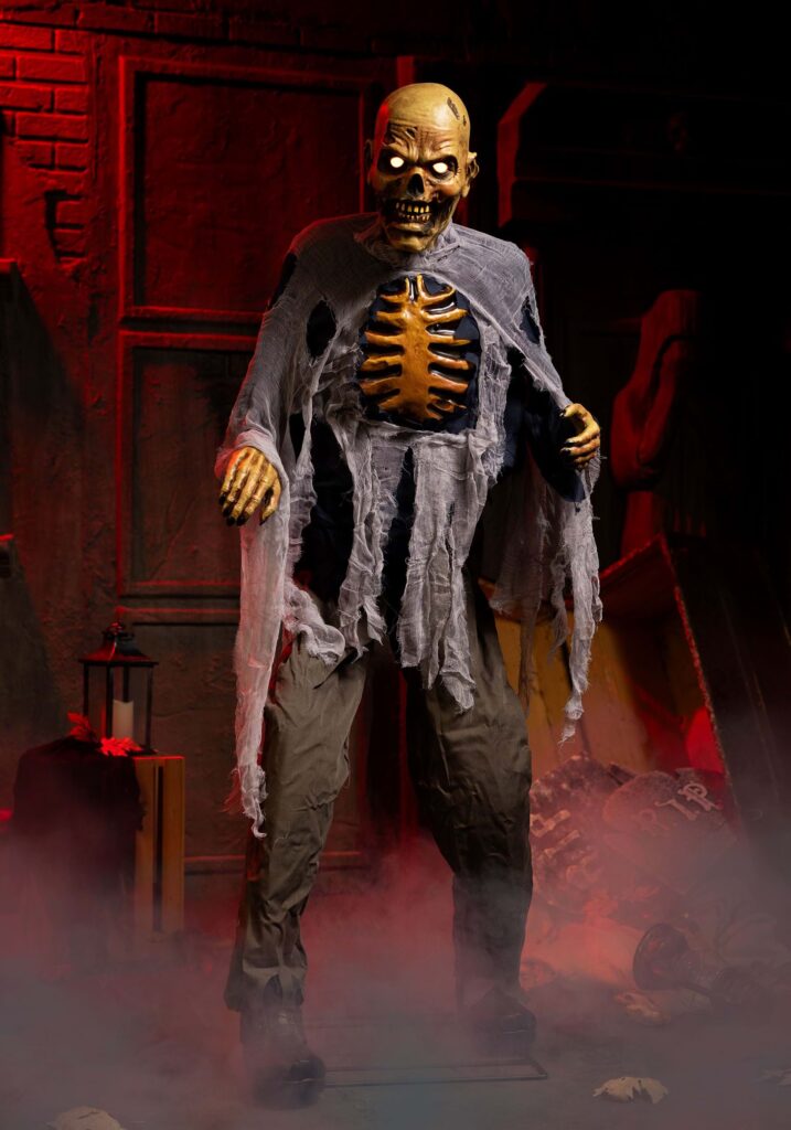 About the New Guy Meet your new undead roommate! This Lumbering Zombie Animatronic is here to bring some spine-chilling vibes to your Halloween setup. Standing tall and looking absolutely deceased, this creepy crawler features a rotting, skeletal torso, tattered clothes, and a face that screams, “I just woke up from a 100-year nap, and by the way, I’m starving.”This groaning, moaning nightmare doesn’t just stand around, oh no, it moves, it searches, and it’s got a job to do: terrifying anyone in its path. With glowing eyes and lurching movements, this ghoul is ready to send shivers down the spines of trick-or-treaters, party guests, and that one friend who definitely wasn’t prepared for a full-on zombie encounter.Decor DetailsDressed in shredded rags with a decayed skeletal chest, this zombie looks like it clawed its way straight out of the graveyard. Its weathered, ghoulish face is enough to make anyone take a few steps back, but the real terror starts when its LED eyes glow with an eerie, unnatural light. Designed to be life-sized at nearly 6 feet tall, this animated prop commands attention, whether you want it to or not.Made for both indoor and covered outdoor use, this zombie is built to deliver frights wherever you place it. It operates on batteries, making it easy to position in the perfect scare spot. Triggered by sound, motion, or an optional footpad (sold separately), this ghoul is always on high alert, ready to send shivers down the spines of anyone who braves your haunted house or Halloween scene.Bring Your Haunted Scene to LifeWhether it’s lurking in a dimly lit hallway, guarding your front porch, or adding a touch of undead dread to your graveyard display, this zombie animatronic is here to make sure your Halloween is truly unforgettable. After all, no Halloween display is complete without a restless zombie searching for its next meal!