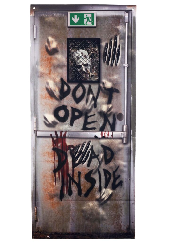 This thick material door curtain is as sturdy as it is spooky. The graphics depict a metal door that looks like it’s seen better days, rusty, weathered, and oh-so-menacing. The front reads, “Don’t Open. Dead Inside.” Now, if that doesn’t scream, “Welcome to my humble abode,” what does?Scratch marks and dents add to the overall “I barely survived the zombie apocalypse” vibe. And let’s not forget the pièce de resistance: a fake window near the top with a zombie’s face peering through. It’s the kind of detail that makes guests second-guess their decision to knock. Measuring 71 inches long (or 180 centimeters for those who enjoy the metric system), this decoration is ideal for ages 14 and up.The Zombified Touch.