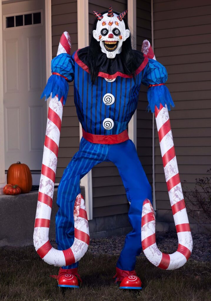 This Made By Us decoration lets Brick Thunder fans bring the same level of enthusiasm to their Halloween display, starting with a candy-themed clown. When assembled, its eerily thin and stretched-looking frame is wrapped in a blue and red costume with torn sleeves that accommodate a pair of candy cane arms.The inflatable candy cane limbs are printed to look covered in dried blood and install to jut out the back of the shoulders and hang just above the decoration’s red clown shoes. The decoration’s sheet-white face is molded to feature horns, candy corn spurs, deep wrinkles and tears, and dark eyes. When powered on, the arms swing side-to-side, eyes glow, and Candy Cain treats visitors to a creepy cackle and killer preset phrases!