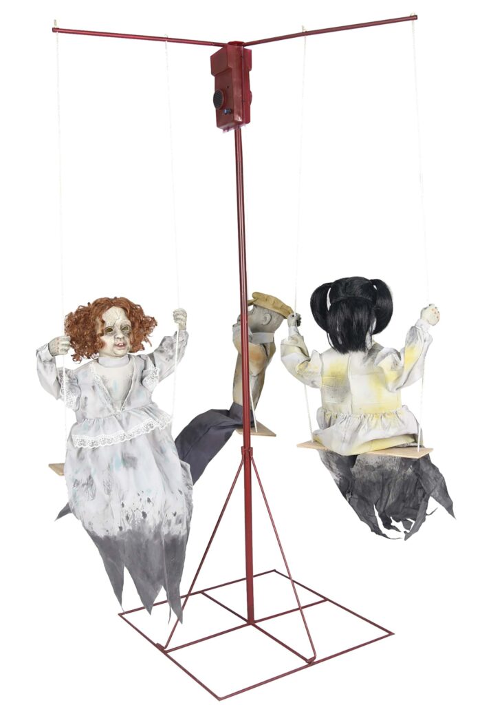 Which is why we have decided to offer these ghostly dolls as a set, complete with swings, creepy looks, and the electronics along with it! The 6-foot-tall swing set spins gently around whenever someone activated the infrared sensor, which works in any lighting conditions. Don’t be too scared, though, or the dolls with sense it