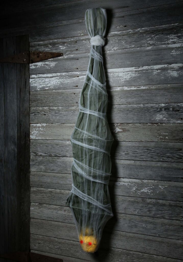 Big Spider, Big ProblemsAdd something truly terrifying to your Halloween decorations. People generally don’t like spiders and others are actually a bit afraid of creepy crawlers. They’re only little creatures, many of them not much bigger than a coin. So, most people may jump a little when happening upon a spider before releasing it outside. However, how big is a spider that can wrap up a 6foot person in their web? Bigger than a coin, that’s for sure. You may have some trouble getting a spider that huge to leave your house. That’s what makes this 6 Foot Light Up Cocoon Corpse absolutely horrifying! Some poor soul faced a fate worse than death. He became an arachnid juice box. When your neighbors see this decoration hanging in your front yard, they’ll think twice about stepping onto your property. What sort of monstrous spider is lurking around your home? Only a few may stick around to find out.