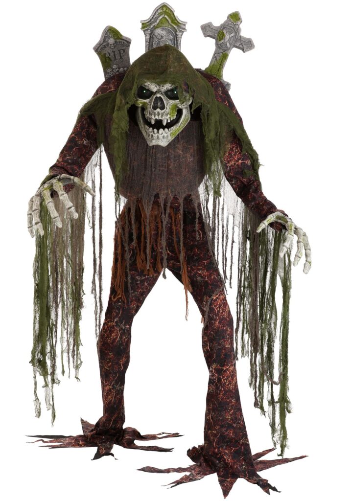 Design & DetailsTony Tombstone comes with a metal stand, animatronic body, power cord, and assembly instructions. The setup takes about 15€“20 minutes. Once activated, Tony’s jaw moves, his right arm lifts, and his LED green eyes glow as he speaks and laughs. He’s motion sensor€“activated and compatible with a step pad (sold separately), with on/off and “try me” modes plus built-in volume control.His robes are made from layered polyester fabric with moss-like texture, draped over a plastic body and reinforced metal frame. Tombstones rise from his back, adding dramatic dimension to his silhouette. For covered outdoor or indoor use only. Must be plugged into a GFCI outlet when used outdoors. Measures 7 feet tall and 4 feet 2 inches wide.Groundskeeper of the GloomWith scale, sound, and just enough animation to make someone take a step back, Tony turns any porch, entryway, or graveyard scene into something with a little more bite. Set him up, switch him on, and let him handle the guests. He knows who belongs, and who doesn’t.