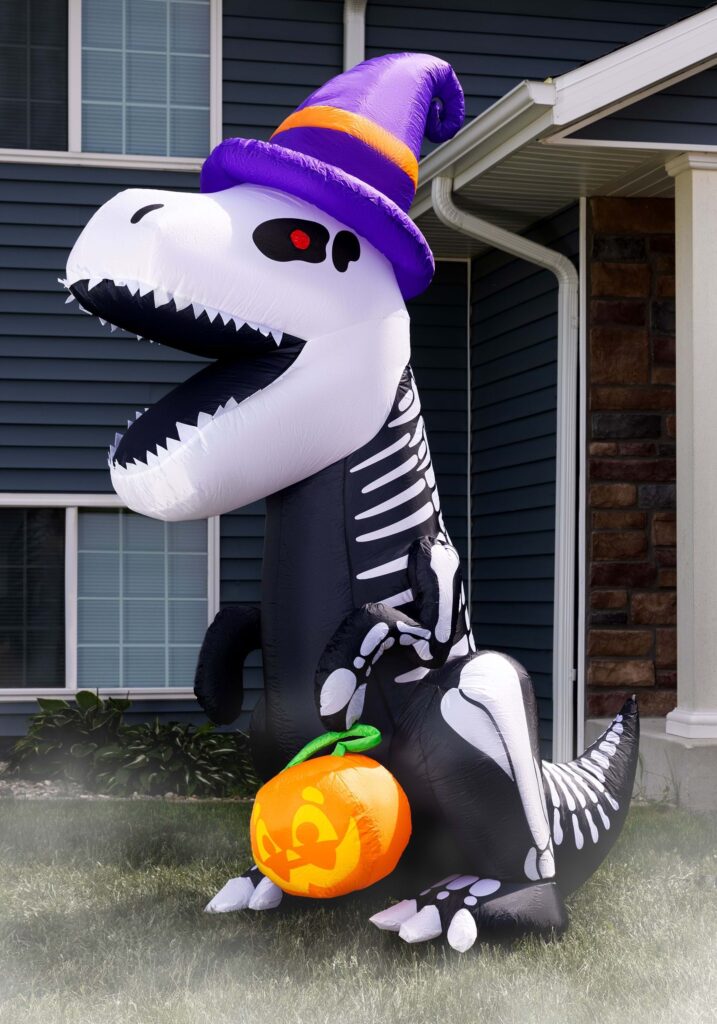 This piece inflates in seconds to produce the desired effect: a unique Halloween entry or lawn decoration. It’s a skeleton of a T-rex that looks like it may be out trick or treating as a witch. It’s carrying a pumpkin bucket and wearing a witch-like hat! There are internal LED lights for added effect.