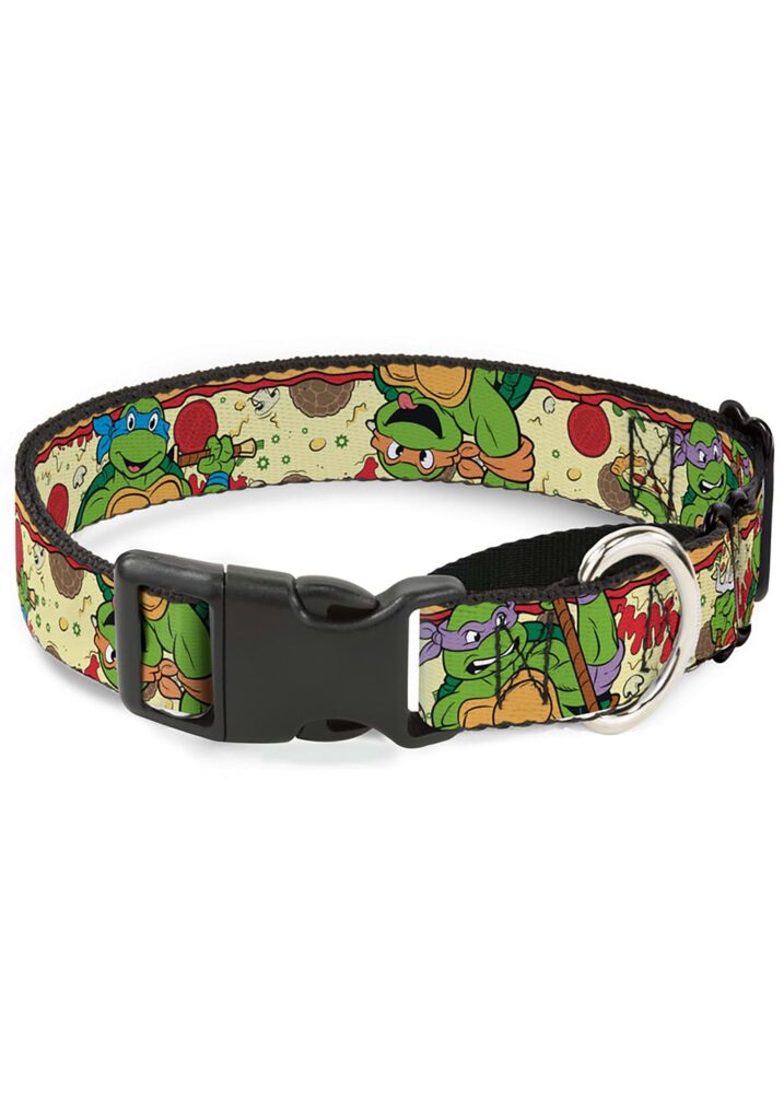 Turtle Power! Be your dog’s hero in a half shell when you outfit them with this 90s Teenage Mutant Ninja Turtles Pizza Plastic Clip Dog Collar! It’s adjustable to fit a variety of TMNT fans, no matter how much ‘za they may have indulged in over the weekend. The Turtles are printed with their favorite meal on polyester fabric that wipes and washes clean. Clip on the matching leash (sold separately) and take a stroll down the block to your favorite pizza place. You might even stumble onto some giant sewer creatures that need to be stopped and some TV reporters who need to be saved. That’s turtle power!