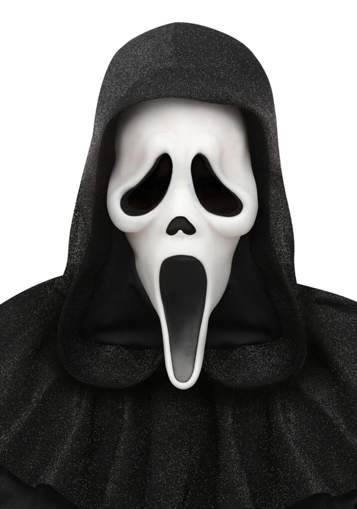 The molded mask features the signature ghostly shape from the original film, capturing every exaggerated curve and hollow with eerie precision. It’s lightweight enough to wear comfortably, but detailed enough to look like it stepped straight off the screen. The expression is frozen in that perfect moment between menace and mockery.A black hood is attached to the mask, completing the classic look and making it easy to throw on with a costume robe or sweatshirt. Whether you’re building a full outfit or adding to your collection, this edition honors the legacy that made a simple phone call feel terrifying.Still Got It.
