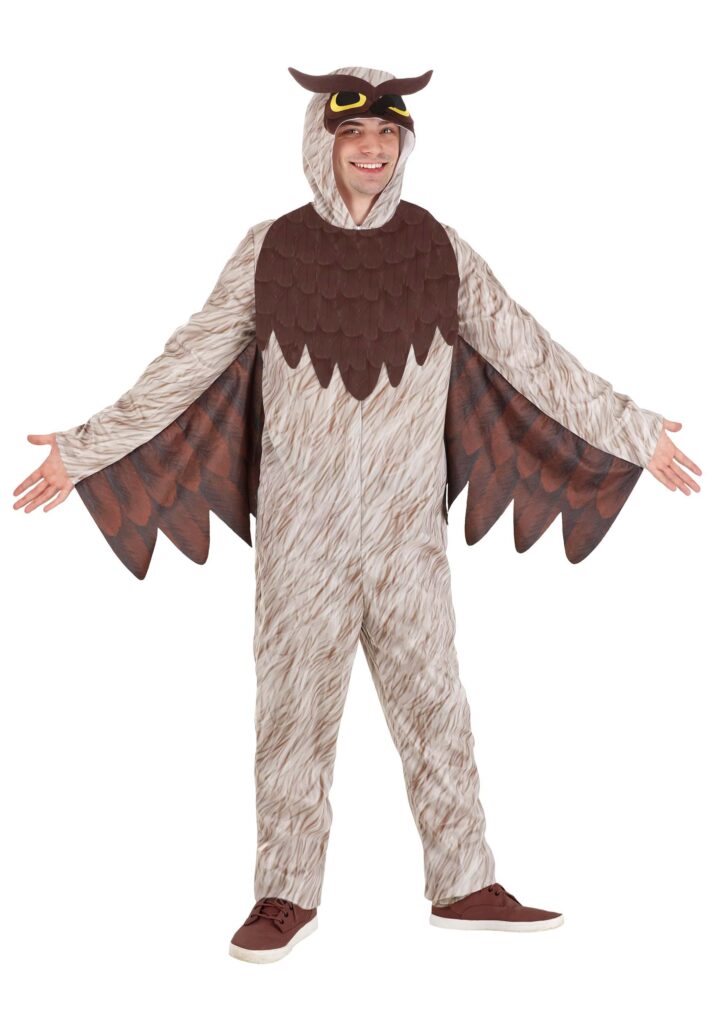 Let’s break it down. The tan hooded jumpsuit has an allover print design that gives you that authentic feathered look. The zipper down the front? That’s not just for convenience, it’s because owls, if they wore costumes, would also appreciate a solid zipper instead of hook-and-loop fasteners. The chest features a dark brown feather piece, adding that extra layer of “yes, I’m definitely an owl; thanks for asking.”The attached wings on the sleeves allow you to spread your arms and really soar (figuratively, not literally, you’re still human, after all). And the hood? It’s got everything you need to complete your transformation: big, embroidered owl eyes and eyebrows that scream, “I’m wise, but also fun.”The Benefits of Being an Owl (for a Night)Think about it: owls are basically nature’s ninjas, silent, sneaky, and always up late at night. In this costume, you get to embody all that coolness without the hassle of actual flight. You’ll stand out at any party, but also, thanks to the cozy fabric, you can just as easily curl up on the couch and binge-watch nature documentaries about owls. So whether you’re looking to swoop in on the costume scene or just feel like a creature of the night, this owl costume is your perfect fit.