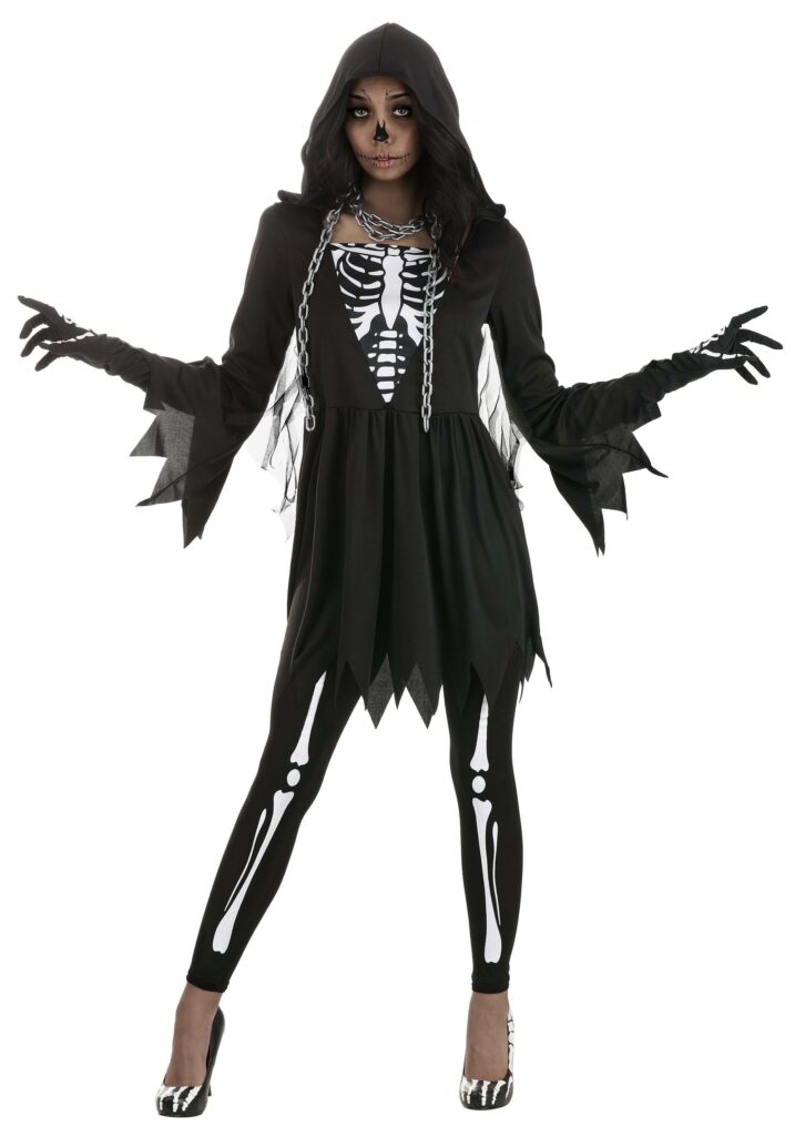 This Death Costume Dress for Women is a great choice for those looking to reap souls in style! The hooded dress has bell sleeves with jagged hems, just like the bottom of the skirt. Skeletal bones are printed on the V-shaped bodice inset, and the pattern is continued down the included leggings. The wrist-length gloves feature the bone print as well.To complete the look, we’ve also added a plastic chain that you can use to accessorize however you’d like. Add your most killer pair of shoes and perhaps some face paint or creative makeup, and you’ll be ready to take on your new career, or the nearest Halloween party!