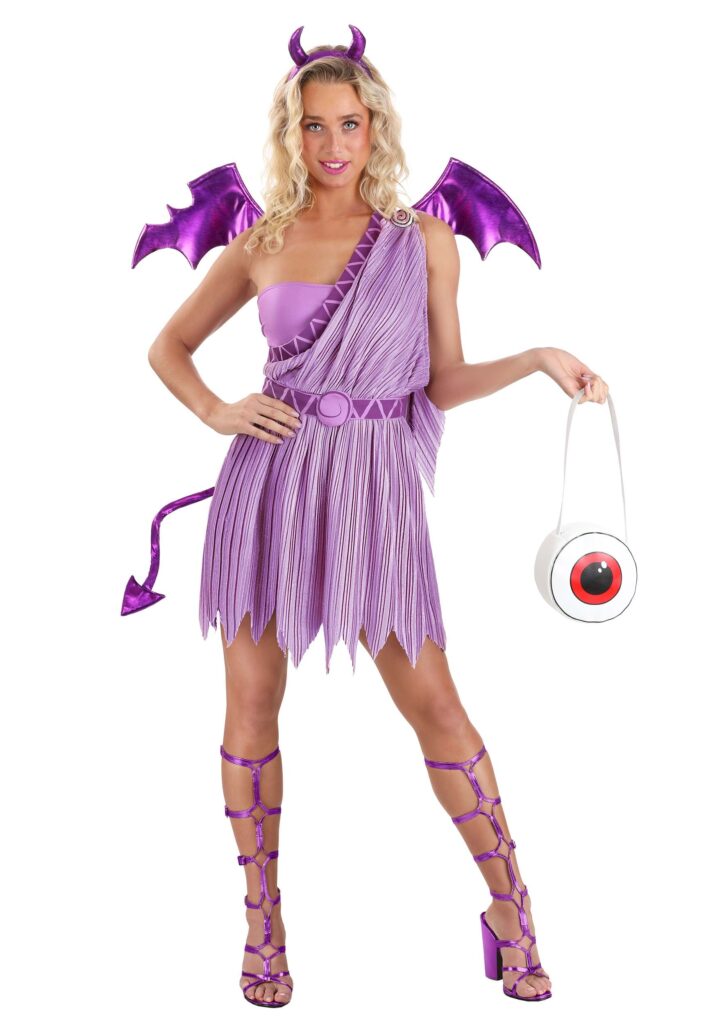 If Is GoodDisney’s Pain is a big fan of the word “if.” So, playing dress-up as the henchman simply makes sense. After all, as an if-loving shapeshifter, the style possibilities for the character are endless. Our officially licensed Adult Disney Hercules Pain Costume Dress is just one of them! Design & DetailsDress as sharply as Pain’s impish teeth with this unique Made By Us silhouette. The costume features a monochrome palette, ensuring the playful look is recognizable. Its comfortable knit dress has a chiffon overlay and zipper for easy dressing. A sewn-on belt and shoulder clasp give it toga style. A metallic tail, wings, and headband add essential detail, while an eyeball purse ensures you can keep an eye on things. ©Disney