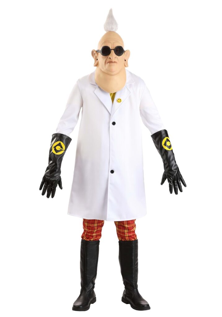 Design & DetailsThis Made By Us costume starts with a simple and comfortable jersey t-shirt with a rib-knit collar. The lightweight top layers under a medium-weight white lab coat with two black plastic buttons and a smiley face lapel pin that draws attention to the vibrant yellow t-shirt. Fiber-filling in the shoulders, meanwhile, ensures fans take on Dr. Nefario’s unique silhouette and signature style.A pair of jersey knit pants with an all-over printed plaid pattern and elastic waistband complete the costume’s base. However, the ensemble wouldn’t be ready for gadget invention or even plotting your next adventure without the included accessories.Liquid-look spandex gloves slide into place, protecting hands from hypothetical lab mishaps or any seasonal chill in the air. The printed Gru symbol on the forearm to the gloves ensures you’re marked loyal to everyone’s favorite not-so-evil genius.But it’s the mask that perfects the look! The sculpted latex, full-coverage mask is intricately detailed to replicate Dr. Nefario’s prominent chin, hooked nose, and long ears. Attached goggles with shaded lenses allow darkened but clear vision, while openings in the mouth and ears let you continue utilizing your normal senses. A tuft of white synthetic hair on the top ensures your version of Dr. Nefario isn’t missing his iconic hairstyle.