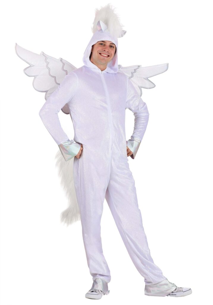 Design & DetailsIf the magical majesty of the winged horse is what you seek, you’re going to love this Adult Heavenly Pegasus costume! This hooded jumpsuit was designed by our Made By Us team to help you live out your Greek Mythology costume dreams. Start by shaping the wings to your liking and get ready to soar thanks to the hook and loop patch. Next, step into the metallic knit cuffs, creating a shiny hoof-like illusion.Zip up the front for an easy fit and pull up the foam-backed hood to show off a faux fur mane and perky ears. The pearly velour fabric will have you feeling supernaturally shiny so all that is left is to practice your Pegasus prance! (Team up with a friend in a Hercules costume to really go the distance.)