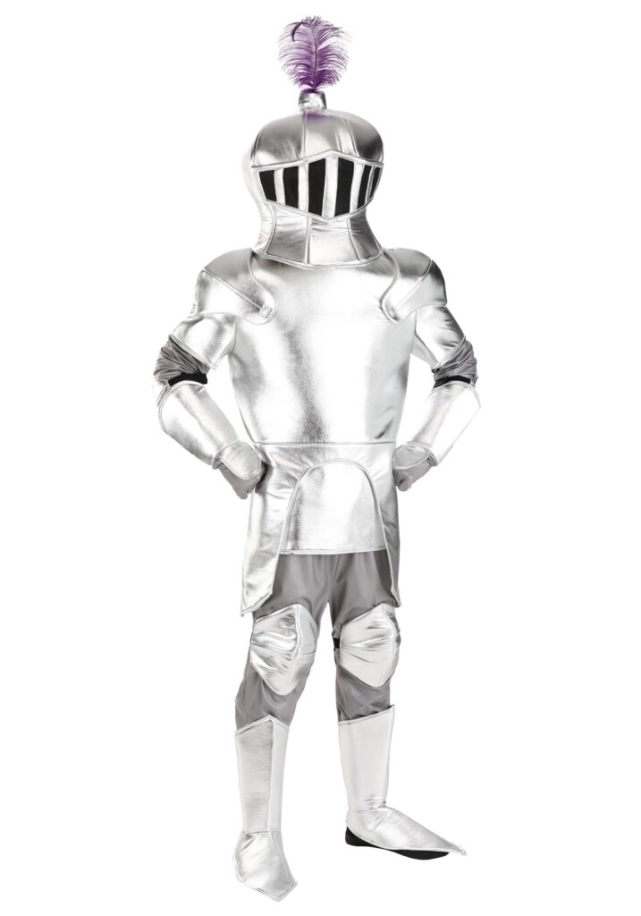 Chivalry’s Not DeadDon your armor and step back into the chivalrous days of the Renaissance with this spectacular Adult Mascot Knight Costume. Perfect for Renaissance fairs, cosplay events, or any costume party, this ensemble will have you looking like you’ve just stepped out of a medieval tale of yore. The costume’s top, designed with foam and metallic lame, mimics the gleaming armor of a valiant knight, complete with removable shoulder pads for that authentic warrior look.Fun DetailsThe illusion of heavy armor is brilliantly executed with lightweight materials, ensuring you can move with the grace of a skilled swordsman. The sleeves, pants, and gloves continue the metallic theme, all crafted from shimmering lame fabric that catches the light as you move. The ensemble is completed with carefully designed accessories: foam forearm covers, boot covers that stretch under the feet for a secure fit, and majestic knee and elbow pads, all ensuring that every part of you looks battle-ready.Regal and Ready HeadpieceThe pièce de résistance? A stunning headpiece with purple feathers and a mesh visor, providing not only an element of noble flair but also practical visibility. Whether you’re portraying a knight at a Renaissance fair or bringing some historical accuracy to a costume party, this knight costume is a show-stopper.The costume is your ticket to a whole new persona as a brace knight, offering endless opportunities to explore Renaissance history and adventure. Just make sure you pair it up with one of our sword accessories to be ready for any new quest!