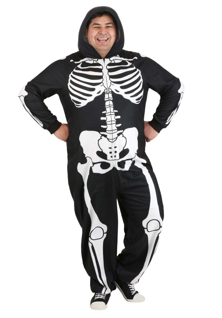 Has anyone ever told you that you have good bone structure? They will when you’re wearing your exclusive Cozy Skeleton Onesie for Adults! The unisex onesie zips down the center front and is made of cozy black polyester minky material. Rib knit on the wrists and ankle cuffs keep you toasty warm. The chest, legs, and arms of the costume are printed with skeleton bones, including ribcage, spine, pelvic bones, kneecaps, and more. The attached hood can be pulled up over your head to help conceal your features. Relaxed Reaper Skeletons and other bony monsters have a good life. No one expects them to dress up for anything, ever. They’ve already shed all of their unnecessary muscles, organs and tissues – why bother putting on the ritz now? Most of us can’t aspire to that lifestyle until after we’re dead, so that’s where a fun and spooky onesie comes in handy. It’s just what you need for either a costume party or a comfy night in.