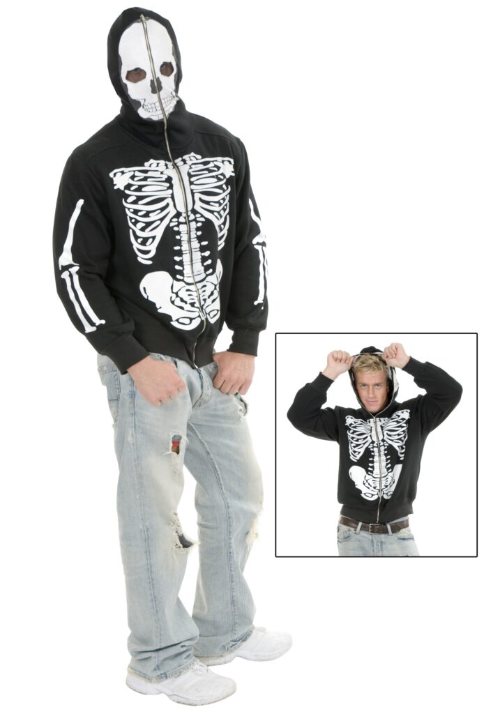 The toughest thing that people tend to forget about the undeath of a skeleton is the fact that they’ve got absolutely no protection from the chilly winds of the fall and coming winters. No meat on their bones to keep them from clattering and not even any skin to block those gusts from chilling them literally to the bone. You might be thinking, Hey, what do they need to keep warm for! ? but that is just the kind of privileged thinking that turns a good-intentioned skeleton into a hostile one, seeking out life force in order t give it a moment in the sun.Fortunately, we have just the thing to help you bony folks to keep yourselves warm without denying your own inner nature. You can step into the light with this Skeleton Hooded Sweatshirt. This zip up hoodie is 100% polyester knit and has a soft fleece inner lining that will make it absolutely sinfully comfortable while warm against your version of a body. The hood can be fully enclosed with the extended zipper to show off your skull, leaving visible space through mesh eye holes. Stay warm and show off those warm bones with no fear of the bitter wind!