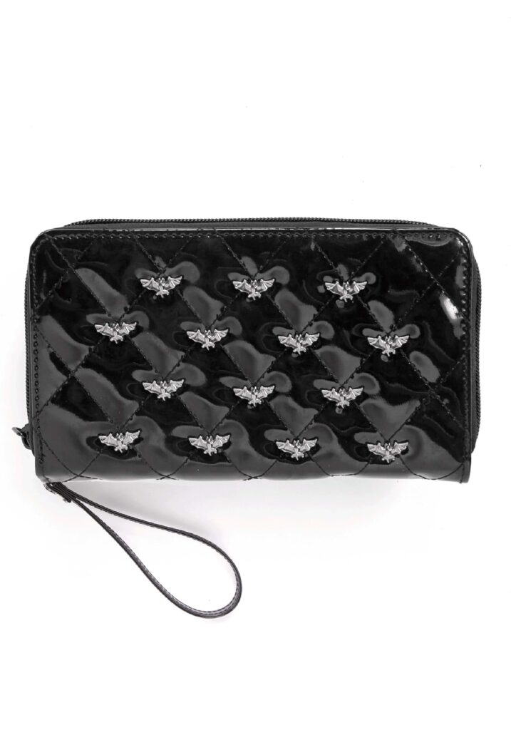 Enhance a Halloween costume or show your love of vampires’ favorite animals when you carry your Bat Studded Quilted Faux Patent Zip-Around Black Wallet! The shiny exterior is sewn with a quilt stitch that has been embellished with bat-shaped gunmetal studs. The wallet unzips to reveal an inner compartment with a coin pouch as well as cash and card slots. Evening Antics Are you a creature of the night? This wallet is ideal for your nocturnal pursuits. Hopefully those pursuits tend more toward going out with friends than hunting humans.