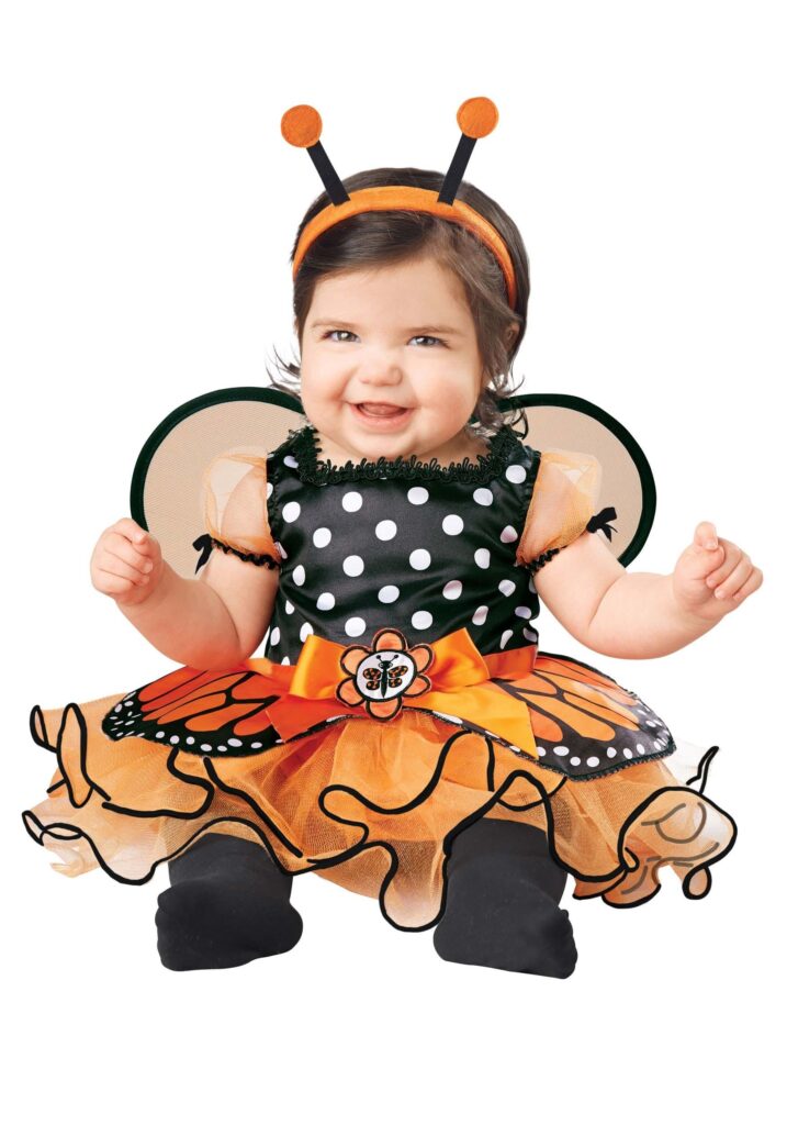 Design & Details Give your tiny tyke the wings they deserve with this exclusive Beautiful Butterfly costume for Infants. This is a Made By Us outfit that begins with a black and white polka dot dress. It fastens with hook and loops in the back for easy changing and has puffed orange sleeves for an extra dose of adorable. The dress’s skirt is made of mesh layers and has a monarch wing overlay. The wings hold their shape with wire frame and fasten with hook and loops and the whole ensemble is topped off with a pom headband!