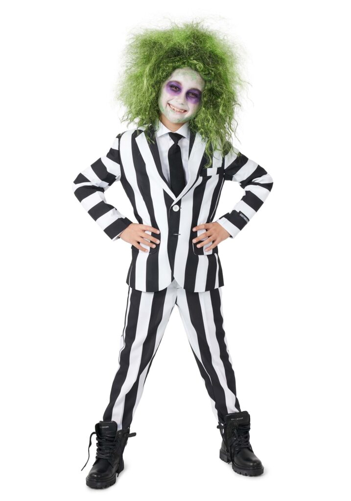 If you’re a little bit strange and unusual, you’re going to love this officially licensed Beetlejuice Suitmeister Child Suit! The fully lined suit jacket is made of soft polyester printed with wide black and white vertical stripes. It features a two-button closure at the front and two false pocket flaps. The matching striped pants have a zippered fly and side-seam pockets. The pre-tied necktie is made of black polyester and fastens behind your neck. Wear it with your favorite short or long-sleeved shirt!  The Ghost with the Most Go ahead – make your own millenium by wearing this cool outfit! Of course, it’s an amazing choice for Halloween, but it’s also a fun pick for formal events hosted by people with a sense of humor. Hey, no one said what kind of suit you were supposed to wear, right? Just remember to follow a few practical precautions: Don’t get close to a sandworm (they can be unpredictably hungry) and definitely don’t sit next to any witch doctors if you like your head the size it is.