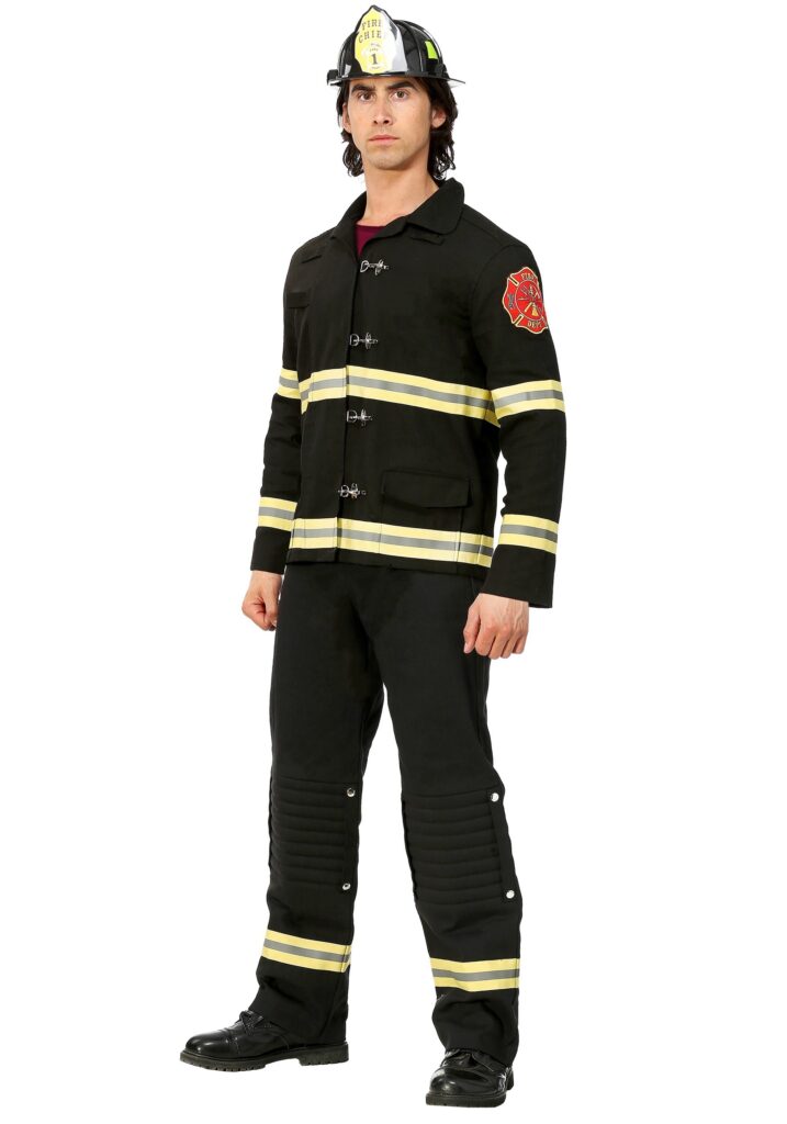 Product DetailsThis adult firefighter uniform costume gives you a realistic look based on the true heroes of your city! The costume comes with a black jacket that has metal clasps at center front. It also has yellow stripes around the chest and sleeves. A big red fire department patch on the shoulder and back adds an extra touch of authenticity to the look. The black pants have yellow stripes around the cuffs. The final piece to this costume comes in the form of a molded plastic helmet. The black helmet has a yellow fire chief design in front, making you look like a brave member of the fire department!This Year, Be Brave!You’ll be ready to play the role of a brave firefighter when you wear this costume! Make sure to pair it up with one of our toy fire axes to complete the look for your next costume party.