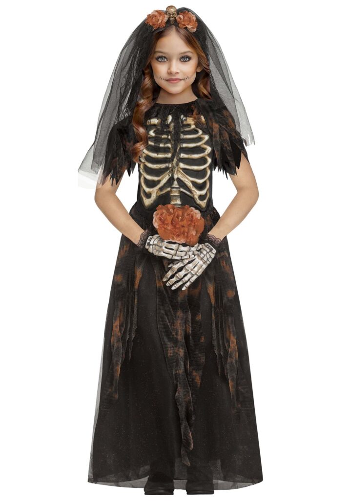 This dress features a sheer black overlay with printed bones on the front of the bodice, giving the illusion of an elegant skeleton underneath. The short, jagged sleeves are decorated with tattered tulle, adding a perfectly spooky texture to the silhouette. The skirt flows to the ankles and includes subtle bone and decay designs for a ghostly finish that’s equal parts eerie and elegant.Included with the costume are matching skeleton gloves that complete the undead bride look, plus a soft black veil attached to a headband adorned with fabric roses. The veil drapes gently over the shoulders and face for that classic “just crawled out of the crypt” vibe, and the orange bouquet ties the look together with a pop of color from beyond the grave.It’s lightweight, comfortable, and built for spooky season appearances both dramatic and playful.A Dress to Die For (Metaphorically)This Bone Bride Costume is made for kids who like their dress-up with a little darkness and a lot of flair. From trick-or-treating to costume parties, she’ll float through the night like the most fashionable ghost in the graveyard.