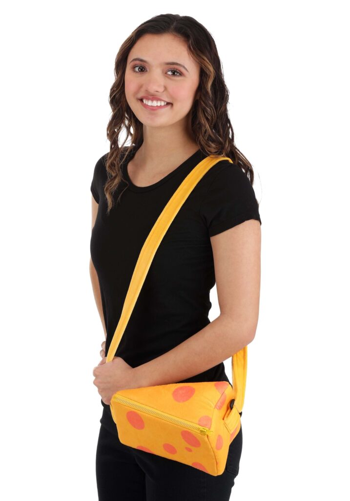 Serve up a tasty look when you add this exclusive Cheese Block Costume Companion! The wedge-shaped purse is made of yellow material patterned with orange dots. A zipper across the top keeps your ID, cash, keys and more safe inside the interior space. Its matching yellow shoulder strap is length-adjustable. The Cheese Stands Alone.