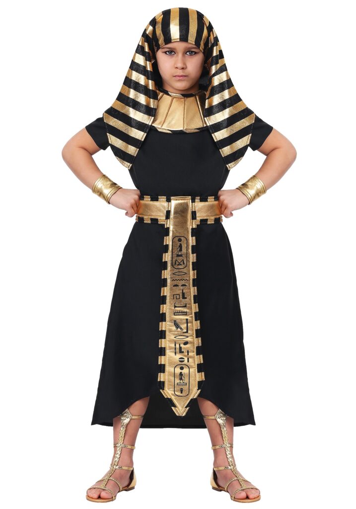 This child costume is one of our many exclusive costumes and helps your child feel like the ruler of a powerful nation! It comes with a black tunic that slips on over the head. It comes with a shiny gold collar that fits around the neck and a matching foam belt that fits around the waist. The belt has various black designs in the middle to help accentuate your child’s new regal appearance. The headpiece is a gold and black striped style and it fits with an elastic strap under the chin. Finish the costume off by fitting the gold wristbands around your child’s wrists and he’ll be ready to issue the next command! Who’s in Command?You can let your young child proclaim his sovereignty when he wears this Pharaoh costume! On second thought, you might want to remain in control of your home you never know if your child will try to recruit you when they attempt to have a pyramid built in their honor!
