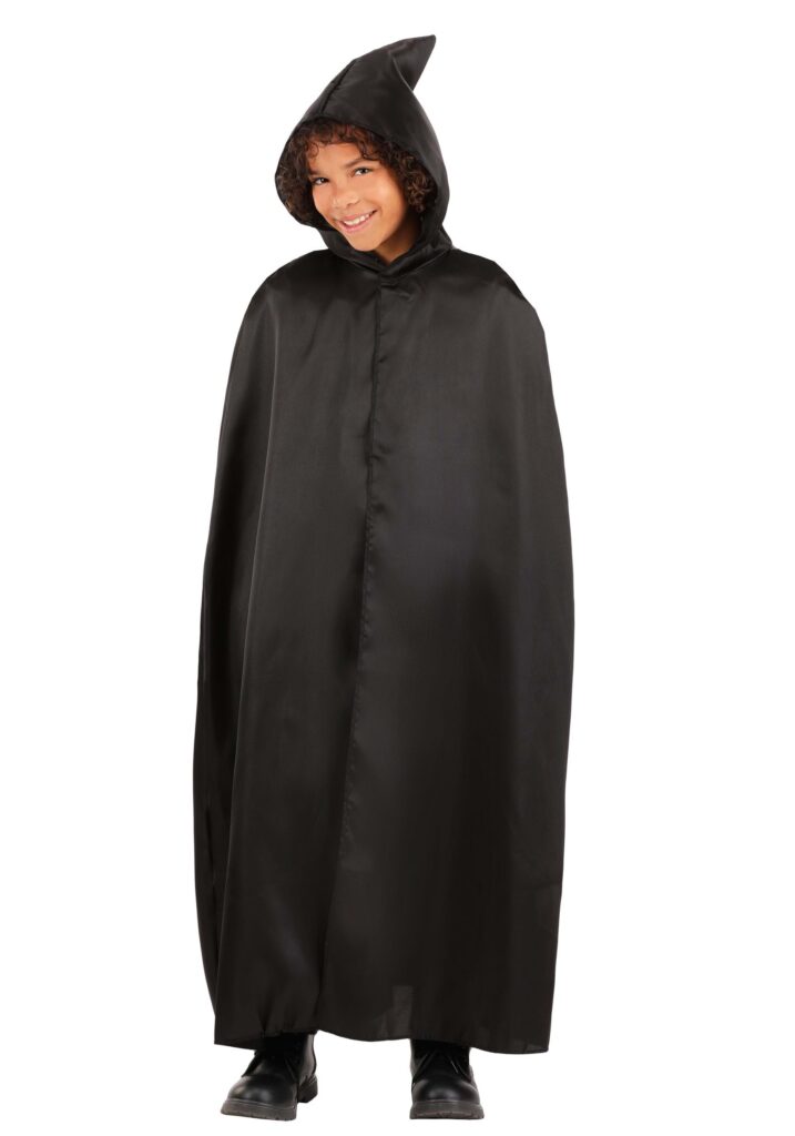 Crafted from 100% polyester satin fabric, this black kids’ cloak is soft yet durable, excellent for any adventure your child imagines. The design is simple yet striking, with a sleek hook-and-loop fastener at the front neck, ensuring easy wear. The hood isn’t just any hood, it boasts a pointed tip, adding an extra dash of mystery. And don’t fret about size; it’s versatile enough to fit most kids up to age 14. Plus, it’s exclusively made by us.Whether it’s a sorcerer costume, a warlock costume, or the timeless appeal of a vampire cloak, our kid’s Black Hooded Cloak adds that magical touch, making it an essential addition to your child’s fantastical wardrobe.Adventure Awaits.