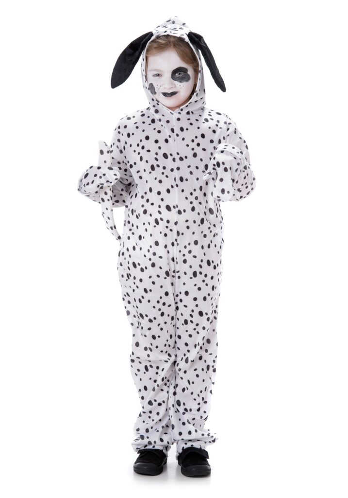 The faux-fur spotted jumpsuit fastens around children via a convenient full zipper in the front and a tail in back. The attached hood fits comfortable around all child-sized heads and has two floppy black ears hanging down. Finally, a pair of included and elastic gloves complete the costume, replacing hands with paws. BARKIN’ FUNHelp your child look more like their fur-friend by picking up black and white face paint to accompany the dalmatian costume.