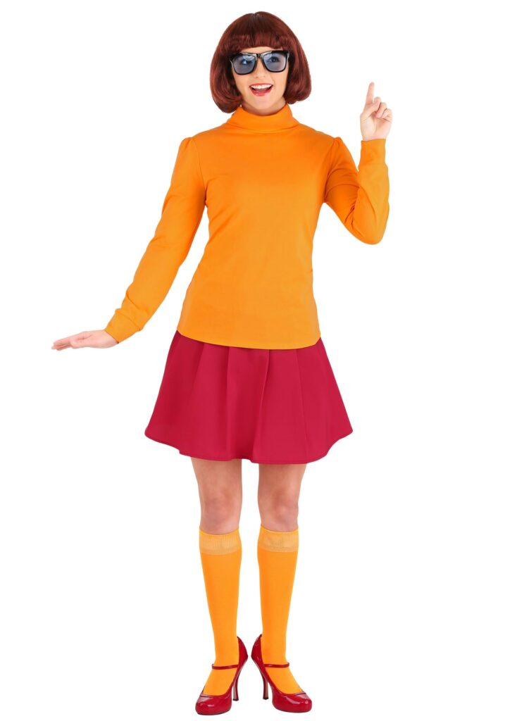 Design & DetailsThis women’s Velma Dinkley costume brings you everything you need to transform into the problem-solving bookworm! The pullover turtle neck stretches to fit and comes in a bright orange color. The skirt fits with an elastic band in the waist and the knee high socks match the sweater for a look that looks like it came right from the 1970s.The glasses have a thick black frame and a pair of tinted, light blue lenses. It all comes together for a look that will have you ready to shout “Jinkies!” If you think that isn’t enough, consider picking up one of our Detective Magnifying Glasses to ensure you never overlook a clue again!Scooby Gang GumptionThis simple outfit is recognizable and the perfect clue that you’re a fan of one of our favorite cartoon sleuths. The only way to improve upon it is to team up with the rest of the Scooby Gang with our collection of Scooby-Doo costumes. The ultimate group costume awaits!