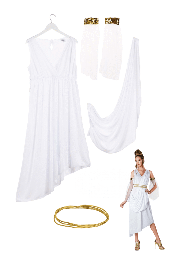 Design & DetailsOur Classic Greek Goddess Costume is the perfect choice for anyone who wants to feel simply divine! This beautiful set starts with a dress that features a plunging neckline and asymmetrical hemline. It’s made of comfortable knit fabrics and secures in the back with hook and loop fastener.A separate piece attaches to the dress at the shoulder and hip with hook and hoop fastener to provide extra draping and detail. Once you tie the gold belt to suit your style and slip on the elastic arm bands with even more draped fabric, you’ll be ready to show off your goddess-like grace!A Gathering of GreeksOur Classic Greek Goddess Costume for Adults lends itself perfectly to a group costume! Add as many gods and goddesses to your group as you’d like with our selection of historical costumes. And don’t forget to complete your outfit by shopping our accessories like sandals, wigs, and jewelry! Whether you decide to create a couples’ costume, go as a group, or rule Olympus on your own, we hope you’ll feel confident and powerful in this classic goddess costume!