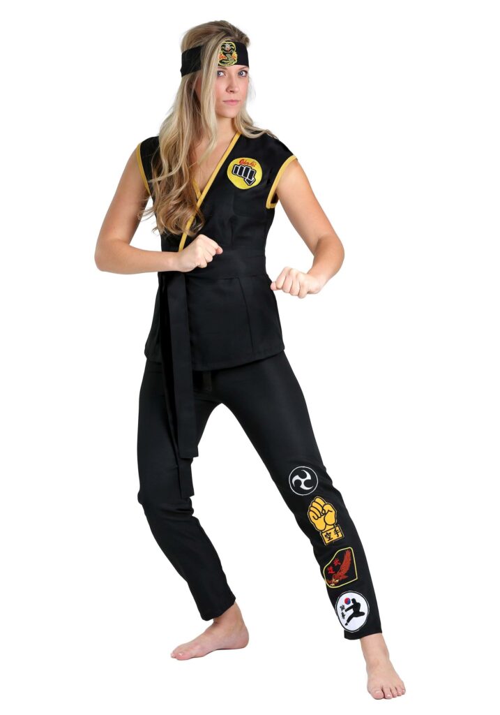 Costumes.com studios, and we’ve partnered with Columbia Pictures to get the details just right. That means this costume is officially licensed, and it’s got the movie inspired look to let you become one of Sensei Kreese’s top karate champs.Defeat does not exist in this dojo, does it? NO, SENSEI! That’s right, failure is not an option. But you won’t have any doubt that you’ll be ready for the All Valley Karate Championships when you have these elite threads. With authentic looking patches, a headband, and a form friendly women’s cut, you’ll be able to take on Karate Kid cosplay in a whole new way. Team up with your partner as Daniel La.