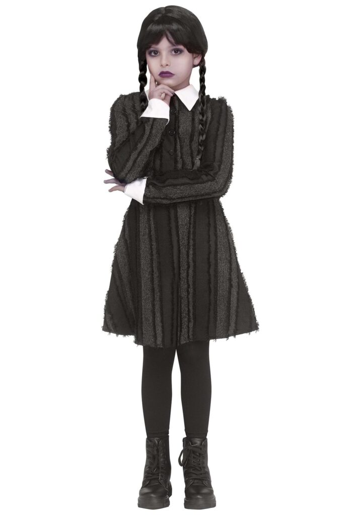 If you’re full of woe inside, you should consider checking out this Creepy Coed Costume Dress for Girls! The approximately knee-length dress fastens at the back and is made of striped grey and black fabric with frayed ribbon piping. The long sleeves end in white cuffs to match the old-fashioned, pointed white collar. A row of decorative black buttons is sewn to the front. Braid your hair in two pigtails, add your favorite pair of combat boots, and you’re ready to take on monsters and humans alike! It’s Not Creepy, It’s Creative.