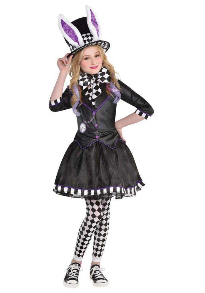 This whimsically dark costume features a black dress with eye-catching purple piping and decorative buttons down the front. The sleeves are accented with black and white checkered patterns that match the oversized bowtie around the neck, because no proper Hatter-Rabbit hybrid leaves home without one. The skirt hem is trimmed with the same checkered pattern, pulling the whole look together in full topsy-turvy style.Also included are matching checkered leggings that carry the pattern all the way to the toes, giving her a bold, unified look that says “I’m late, but fabulous.” And then there’s the hat: a mini top hat adorned with a black and white checkered band and soft rabbit ears sticking straight out the top. It’s quirky, cute, and just a little bit mad in the best possible way.Wonderland Just Got Weirder.