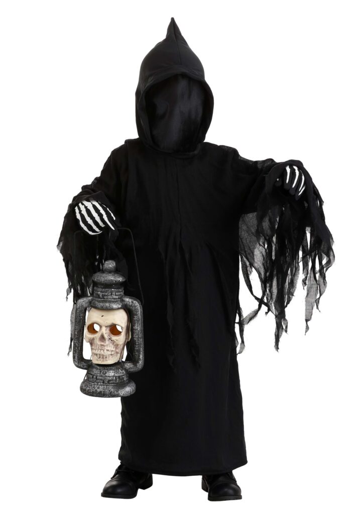 Let your little one soar in style with this Toddler Dark Reaper costume. This hooded robe is a Made By Us design that features a ghostly drape, long, oversized sleeves, and layers of gauze for a supernatural look. The hood has a mesh covering to allow your kid to see even while others will only observe the gaunt face of a grim reaper. Of course, the covering can be pulled back to reveal a grin for photo time.Long elbow-length gloves feature a skeletal print for that extra finesse. From there, feel free to add some Reaper accessories, like a skull lantern or a wicked scythe to complete this haunting transformation!