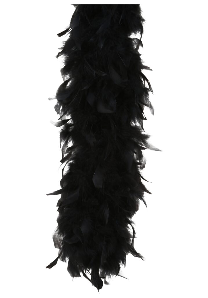 Back in the Roaring 20s, numbers meant something and precision was king. Drinks were calculated to the dram, druggists carefully weighed each prescription, and the beats of music were carefully calculated to famous dance moves. Although, to be fair, not everything was precise; the hours of the night often slipped away into the wee hours of the morning without anyone batting a lash.Well, this may not be the Jazz Age anymore, but this festive and fluffy 120g Deluxe Black Boa will add that precise pizzazz needed to complete any flapper or showgirl costume. It is six decadent feet of black-dyed marabou feathers and is bound to tickle the fancy of anyone in the speakeasy. It pairs perfectly with a drop-waist tank dress, a sequin headband, and a precision-mixed Gin Rickey. Talk about drama!