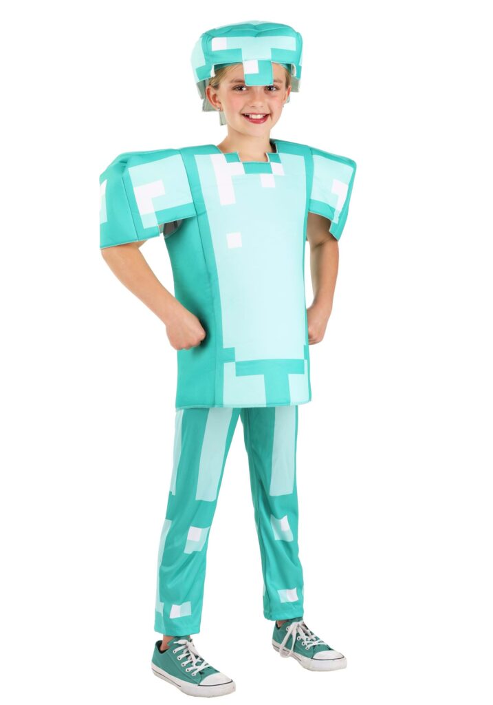 The diamond armor costume is modeled after the classic armor seen in Minecraft. It comes with a 3D constructed top, a pair of pants and a headpiece. It’s not made of real diamonds (which would probably be pretty heavy to lug around). Instead, it’s made out of fabric and foam, which means it’ll be easy for your child to wear as he explores the biome of your neighborhood! Just make sure you arm your child with a Minecraft weapon or two in case he bumps into a Creeper out there! Dig It.