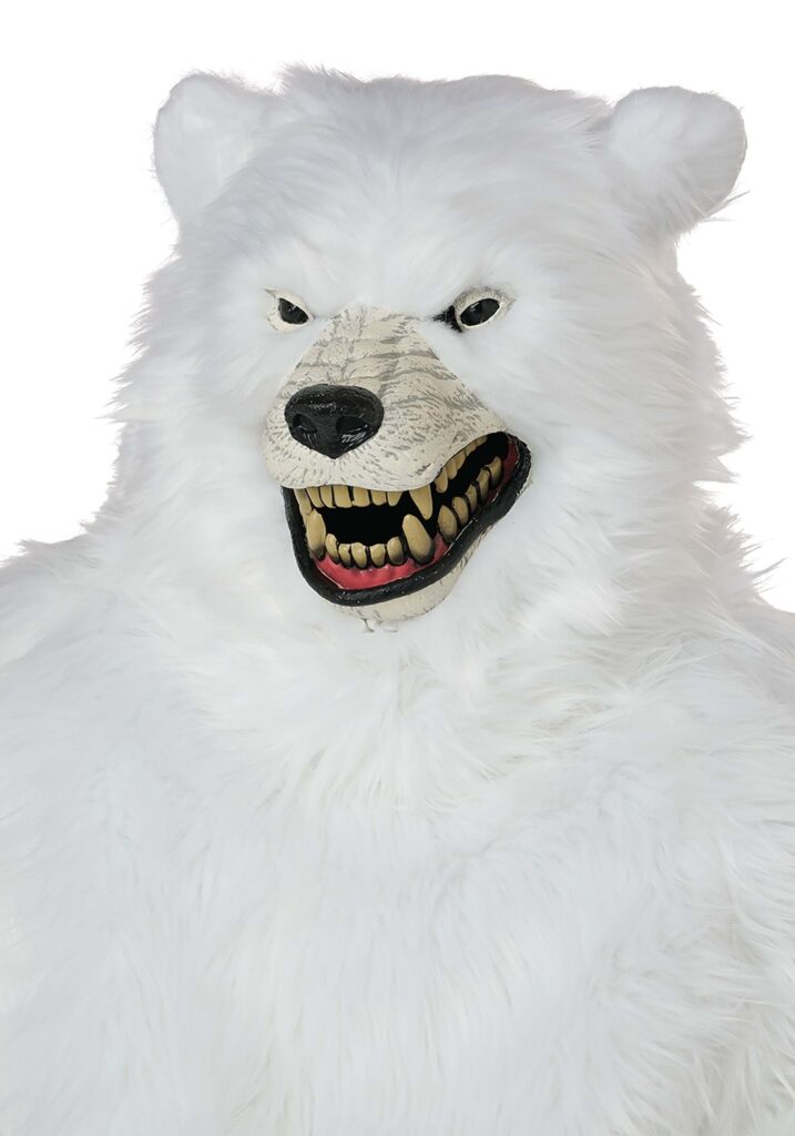 The centerpiece of this costume is the terrifying Ani-Motion mask, which uses internal mechanics to move with your jaw. As you growl, shout, or casually chat about snacks, the mouth opens and closes in sync, revealing a row of oversized, sinister teeth. The sculpted face blends seamlessly into a shaggy layer of bright white faux fur that covers the head and shoulders, creating a larger-than-life polar menace.This is a headpiece built for full effect, from the narrow, menacing eyes to the jawline full of unsettling detail. The rest of the costume is up to you, making it a flexible fit for pairing with a full bodysuit, winter wear, or something completely unexpected.Ice-Cold Looks, Full-Throttle FearWith the Ani-Motion feature enhancing every movement, the Deluxe Polar Bear delivers a full sensory scare, and looks pretty great in low lighting too. Add it to your costume lineup and prepare to be the apex creature of any snow-covered gathering.
