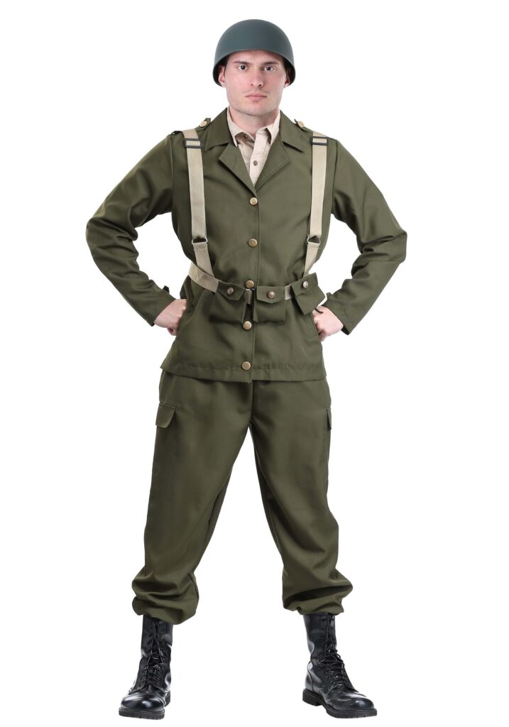 Design & DetailsThis deluxe WW2 Soldier Costume for adults is made right here at HalloweenCostumes.com. And that means it’s Made by Us. Our talented design team puts in extra attention to details when we design our styles so that you can be sure our costumes will have a fit and feel a cut above the competition.This Soldier Costume does not disappoint. It comes with a jacket, pants, belt, and a helmet. It typical army olive green, the jacket secures in the front with buttons. The belt has shoulder straps and attached pouches, and the plastic helmet finishes the costume style. Take on your missionNo matter the task, we’ve got the costumes that will let you complete your mission. Suit up with your friends for a group theme or be a brave soldier on a very special solo assignment. You can add a toy rifle or other accessories, too, since we have plenty of great ways to accessorize this costume style. Check out our entire selection to make an informed decision!