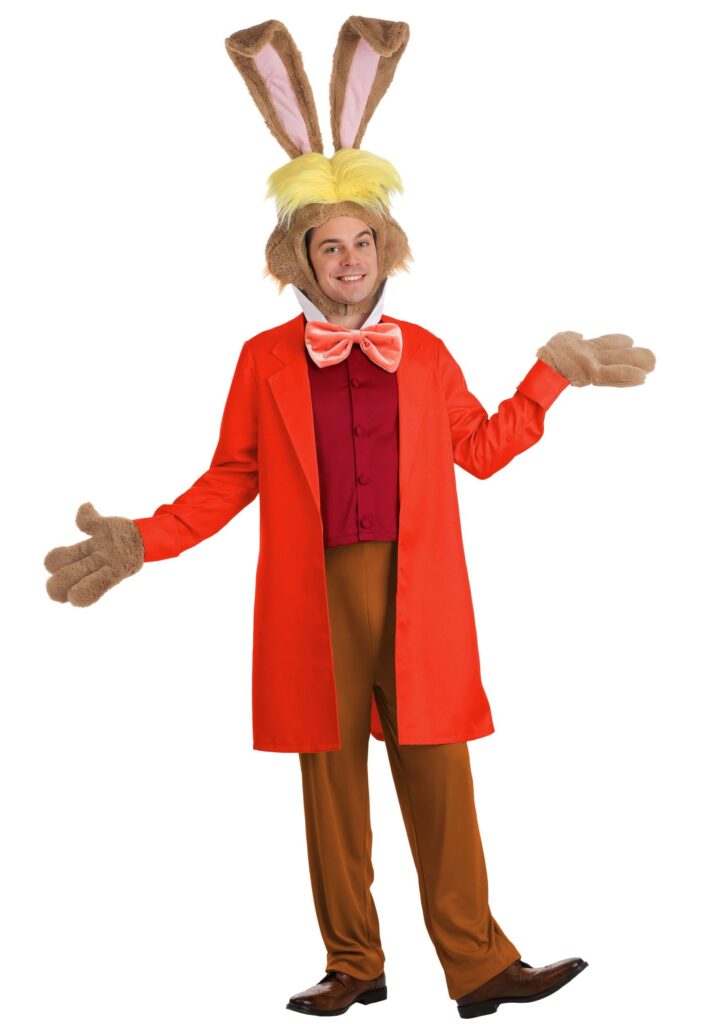 This costume features an orange jacket with notched lapels and decorative buttons. The deep red vest with attached bowtie adds a vibrant touch while the plush character hood, complete with bunny ears, gives you the definitive look of the March Hare. Brown stretch pants and oversized gloves are included to complete the outfit.©Disney