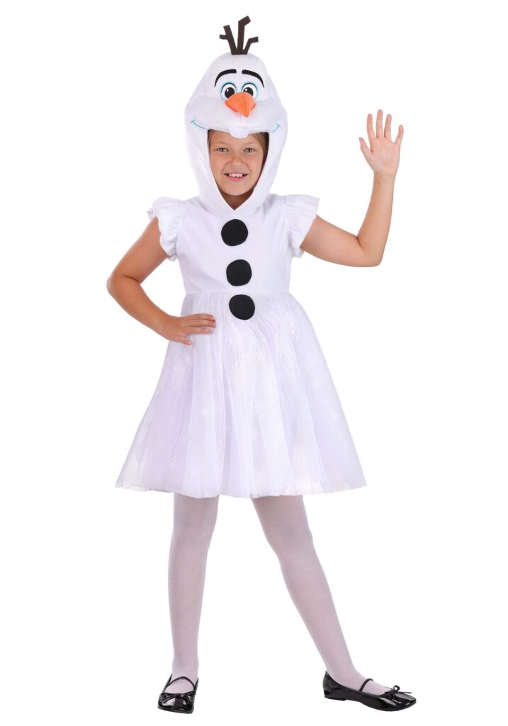 Design & DetailsThis costume’s soft white dress features flutter sleeves and a fluffy tulle skirt, mimicking the look of the lovable snowman. The attached hood showcases embroidered details of Olaf’s cheerful face, complete with a 3D carrot nose and felt twig hair. Three “coal” buttons on the front complete the costume’s Frozen-inspired look.©Disney