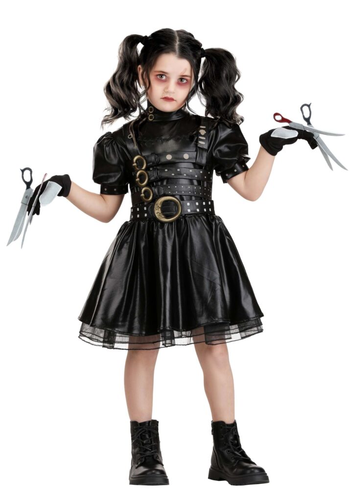 This pint-sized masterpiece starts with a faux vinyl dress that has a four-way stretch design. It’s perfect for dramatic twirls, cautious high-fives, and awkwardly adorable attempts at holding things. A soft satin liner ensures your little one stays comfy, even while brooding mysteriously in the corner. The bodice features stitched details, screen-printed studs, and decorative belts that fasten easily with hook-and-loop closures hidden under embroidered faux buckles.For extra flair, the costume includes a tulle petticoat and puffed sleeve shoulders, adding just the right amount of gothic elegance. And of course, it wouldn’t be Scissorhands without the gloves! These feature sublimated designs to match Edward’s signature look, plus soft felt “scissors” attached with elastic bands.A Cutie Above the Rest.