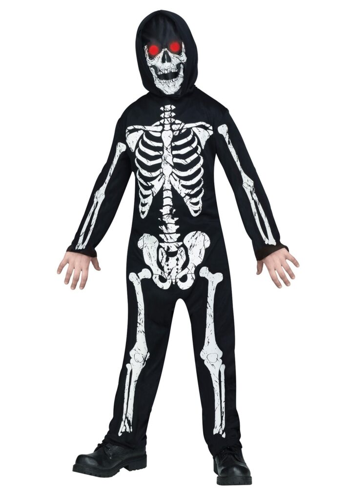 Light Up Skeleton Costume for Kids! This classic skeleton costume gets a fun upgrade with glowing red eyes that fade in and out! The comfortable jumpsuit features a skull print, and the included hood has a screen-printed skull face to match. The glowing eyes are powered by 3 AA batteries (not included) for hours of spooky fun.