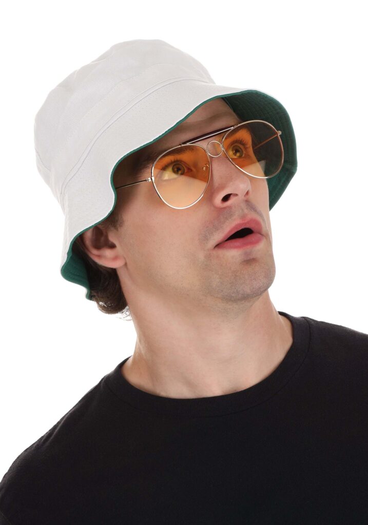 This Fear and Loathing in Las Vegas Hat and Glasses Kit is the real deal. Made of 100% cotton, the Bonnie style hat sports that quirky green lining that screams Raoul Duke. The glasses? Oh, they’re the cherry on top, featuring metal frames and plastic lenses. Just a heads-up though, they’re more about style than UV protection. This kit is officially licensed, so you’ll fit right into the twisted universe of Fear and Loathing.Why Stop at the Hat and Glasses?Getting this kit is like dipping your toes into the madness that is “Fear and Loathing in Las Vegas.” So why not jump in completely with one of our Fear and Loathing in Las Vegas costumes! But without this kit, you’ll have everyone asking, “As your attorney, I advise you to buy that hat and glasses kit.”