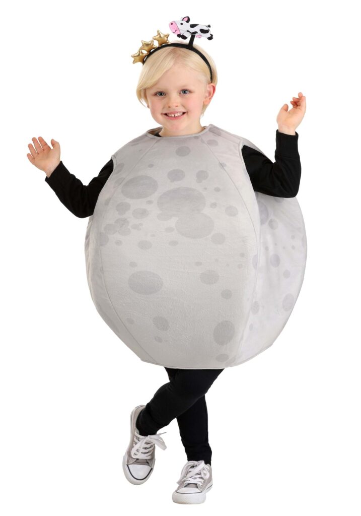 Let your little one take up space in the best possible way while wearing this exclusive Full Moon Costume for Toddlers! The unisex outfit includes an oversized, sleeveless tunic made of gray polyester velour and jersey knit fabric. It fastens at the left shoulder and is lined with a foam layer to give it a rounded appearance. The velour outer shell is printed all over with darker gray crater graphics. The black headband is decorated with three stuffed fabric stars and a felt cow who is clearly jumping over the moon. Moonwalk “That’s one small step for a man; one giant leap for mankind!” You’ve seen videos of people walking on the moon, but have you ever seen the moon walking down the street, knocking on people’s doors and asking for candy? It’s an amazing sight that astronomers were unprepared for. They’re planning to conduct studies of it for years to come. Some experiment questions include, “Does the moon prefer candy corn to fruit taffy?” and “How many chocolate bars can the moon consume before the sugar kicks in?”